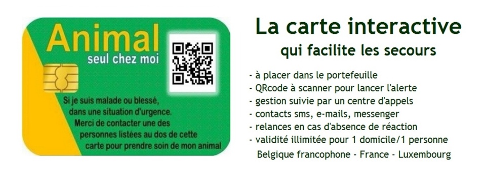 toutes les personnes désignées par le membre. Le service de vigilance est dès à présent proposé à toute personne ayant un animal (ou+) de compagnie par la souscription à la carte "Animal seul chez moi". Cette extension est née d'un constat : le petit carton crayonné de numéros de téléphone disposé dans le portefeuille n'est plus efficace. En cas d'accident ou d'hospitalisation imprévue,Les services de secours, ambulanciers, pompiers, policiers n'ont plus le temps, voire le droit, de contacter des tiers inconnus. A quoi s'ajoutent des numéros obsolètes, des appels sans réponse, la réglementation de protection des données privées (rgpd), etc... C'est là tout l'avantage de la carte interactive : les urgentistes n'ont plus qu'un simple QRcode spécifique et nominatif à scanner sur la carte, en moins de 10 secondes. La réception du code déclenche un signal auprès des bénévoles qui relaient l'alerte à toutes les personnes désignées par le porteur de la carte et en assurent le suivi. Le service est actif dans les régions francophones de Belgique, en France et au Grand Duché du Luxembourg. Au besoin, selon des conventions préétablies, des bénévoles peuvent se rendre au domicile et prendre en charge les animaux.